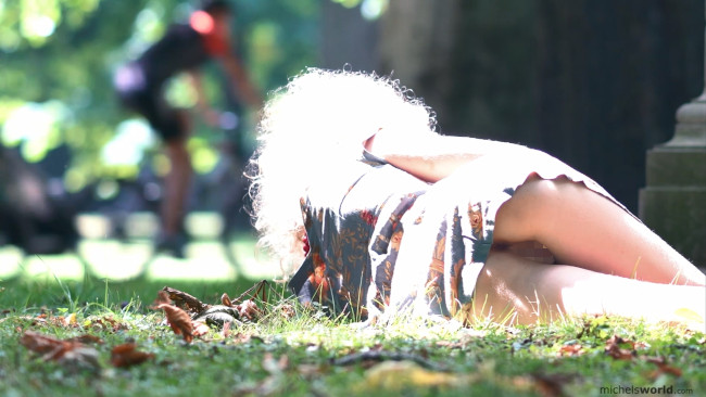 前屈みになった時や、草むらに横たわった時のオマンコも刺激的なら、公園を全裸で歩く様子も露出好きには堪りません。